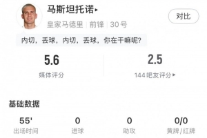 体育资讯1月29日讯 欧冠联赛阶段第8轮,皇马客战本菲卡,马斯坦托诺代表皇马首发出战,在下半场第55分钟被换下,球员此役数据如下: